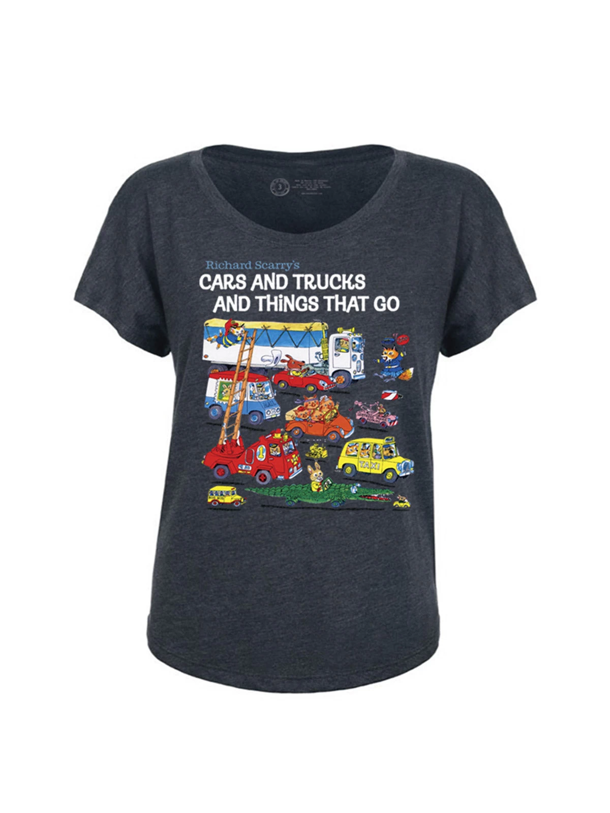 Cars and Trucks and Things That Go adult women’s t-shirt – It’s time to start your engines in this Richard Scarry classic all about vehicles. Buckle-up for a fun-filled day of planes, trains, automobiles … and even a pickle truck! Featuring hundreds of clearly labeled vehicles, this is the perfect book for little vehicle fans from the one and only Richard Scarry.