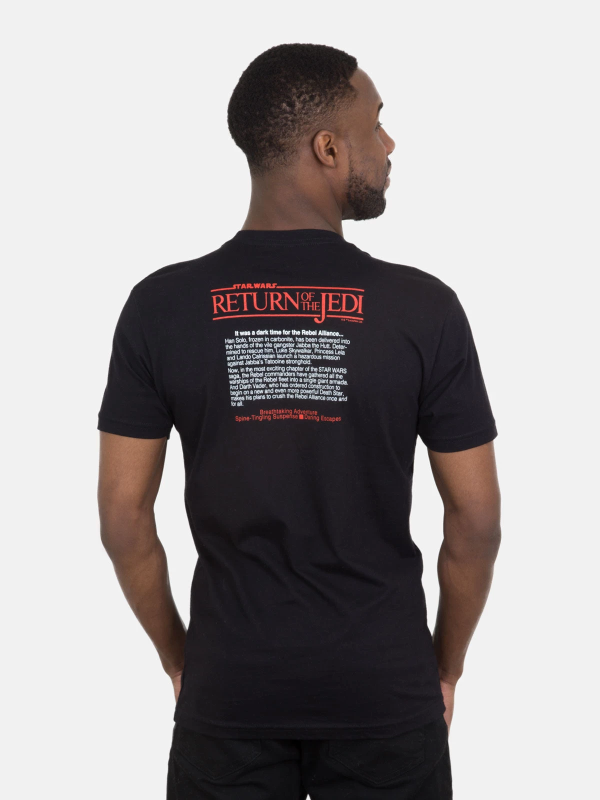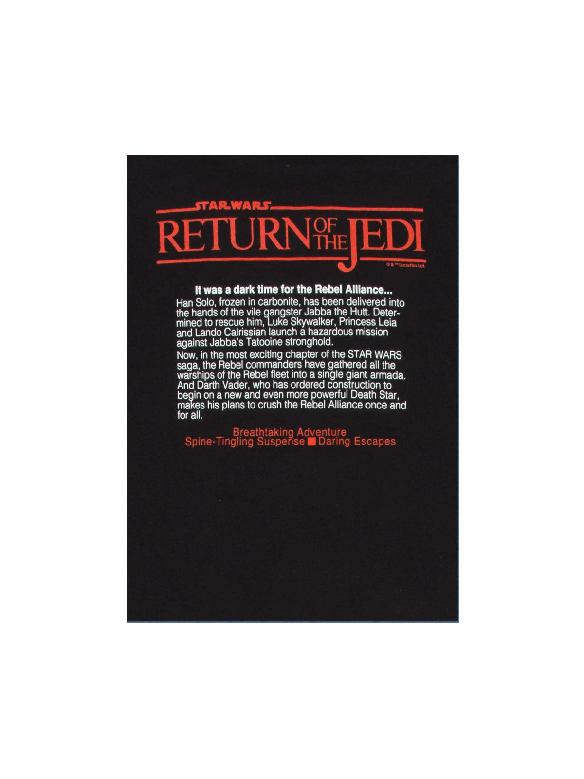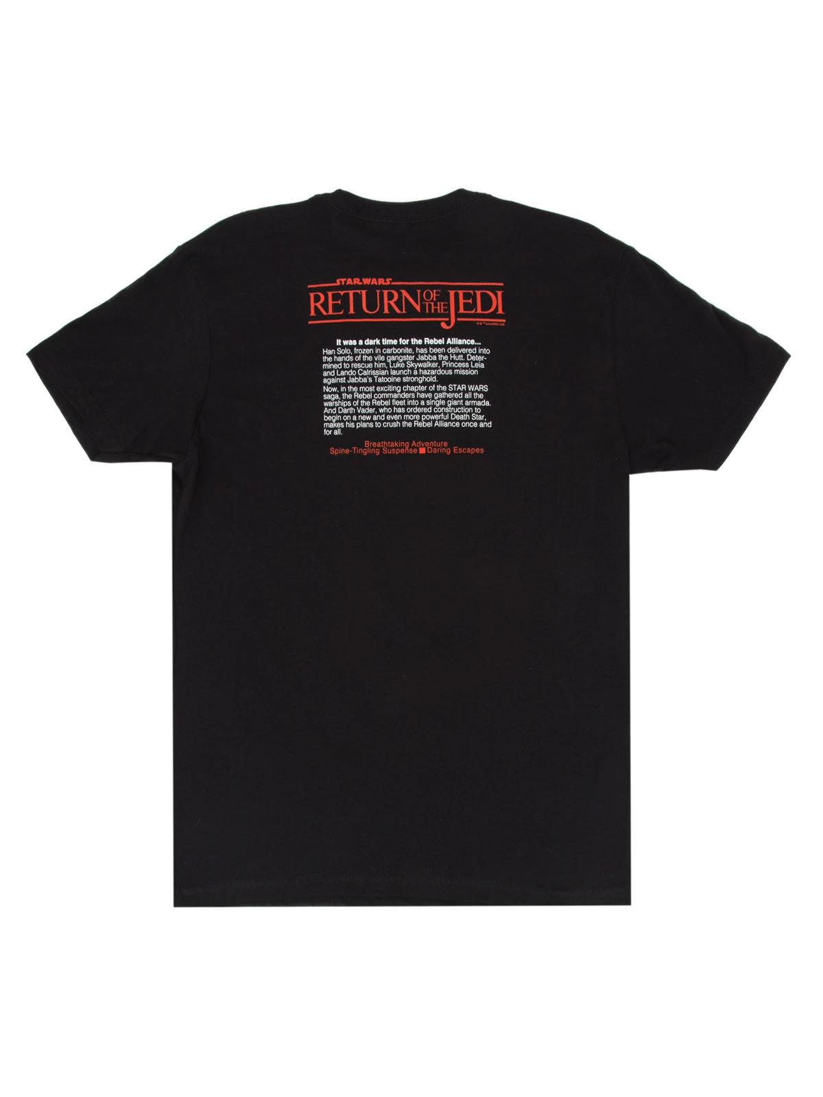 “It was a dark time for the Rebel Alliance…” Star Wars™: Return of the Jedi novelization was first published by Del Rey in 1983, around the same time as the movie release of Star Wars™: Return of the Jedi. This double-sided tee has the first edition cover art on the front and the book description on the back.